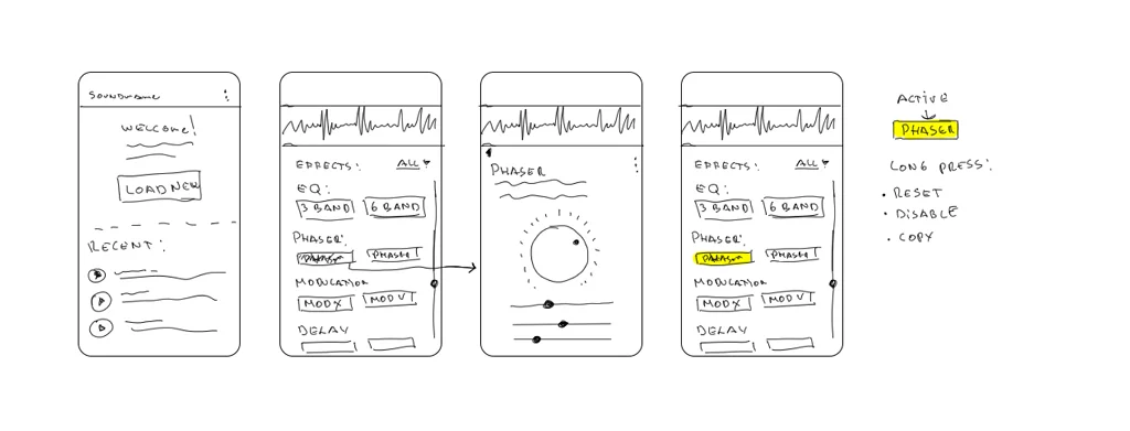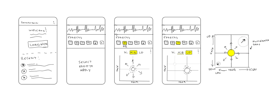 Exploring the best way to visually represent the effect controls. The goal is to have simplified controls for adding and editing various effects to the audio file. After a few rounds of explorations, decided to go with a draggable effect controller.